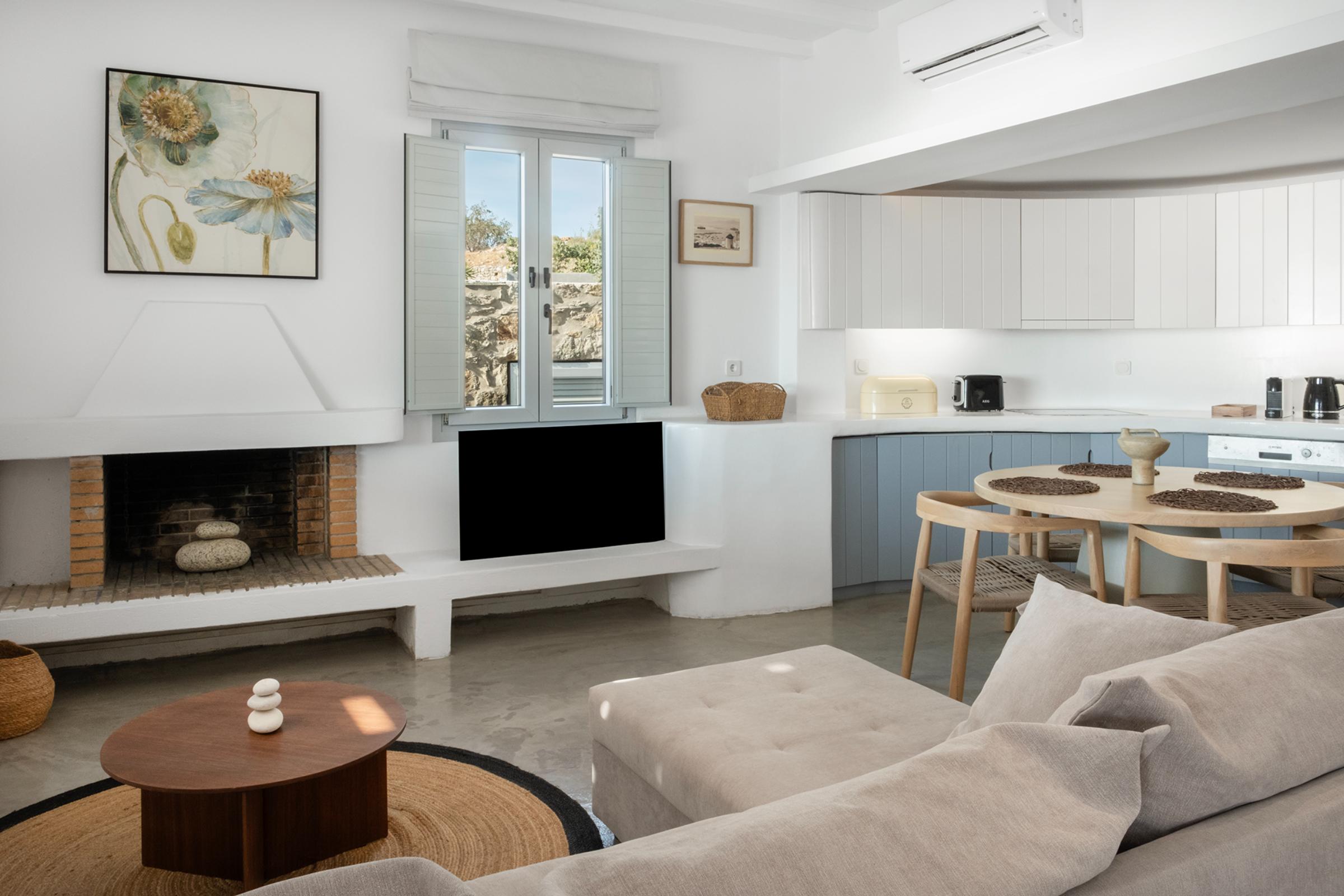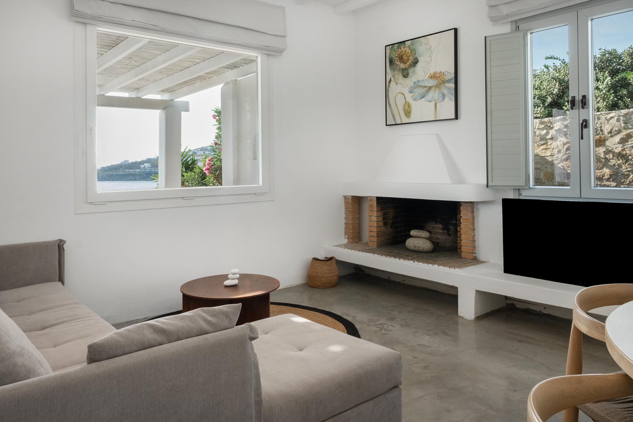 Open plan living area with a cozy fireplace and dining area with sea views and direct access to the outdoor spaces, the pool, and independent access